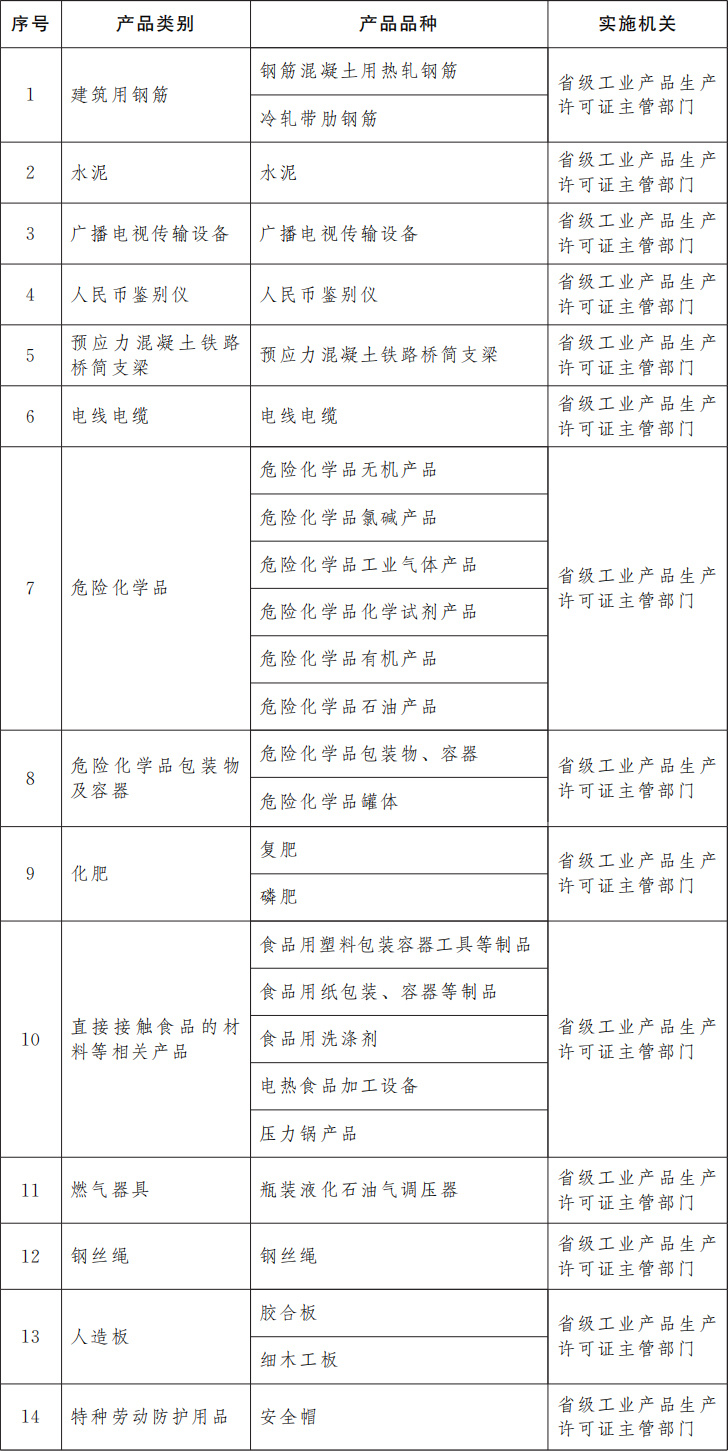 為保障重要工業(yè)產(chǎn)品質(zhì)量安全,強化產(chǎn)品準入管理和源頭治理,防范產(chǎn)品質(zhì)量安全重大風(fēng)險,確保人民群眾生命財產(chǎn)安全和公共安全,國務(wù)院決定,調整完善工業(yè)產(chǎn)品生產(chǎn)許可證管理目錄,對冷軋帶肋鋼筋、瓶裝液化石油氣調壓器、鋼絲繩、膠合板、細木工板、安全帽等6種產(chǎn)品實(shí)施工業(yè)產(chǎn)品生產(chǎn)許可證管理。調整后,實(shí)施工業(yè)產(chǎn)品生產(chǎn)許可證管理的產(chǎn)品共計14類(lèi)27個(gè)品種,由省級工業(yè)產(chǎn)品生產(chǎn)許可證主管部門(mén)負責實(shí)施,相關(guān)審批權限不得下放。同時(shí),化肥生產(chǎn)許可證審批方式由告知承諾調整為“先核后證”審批。