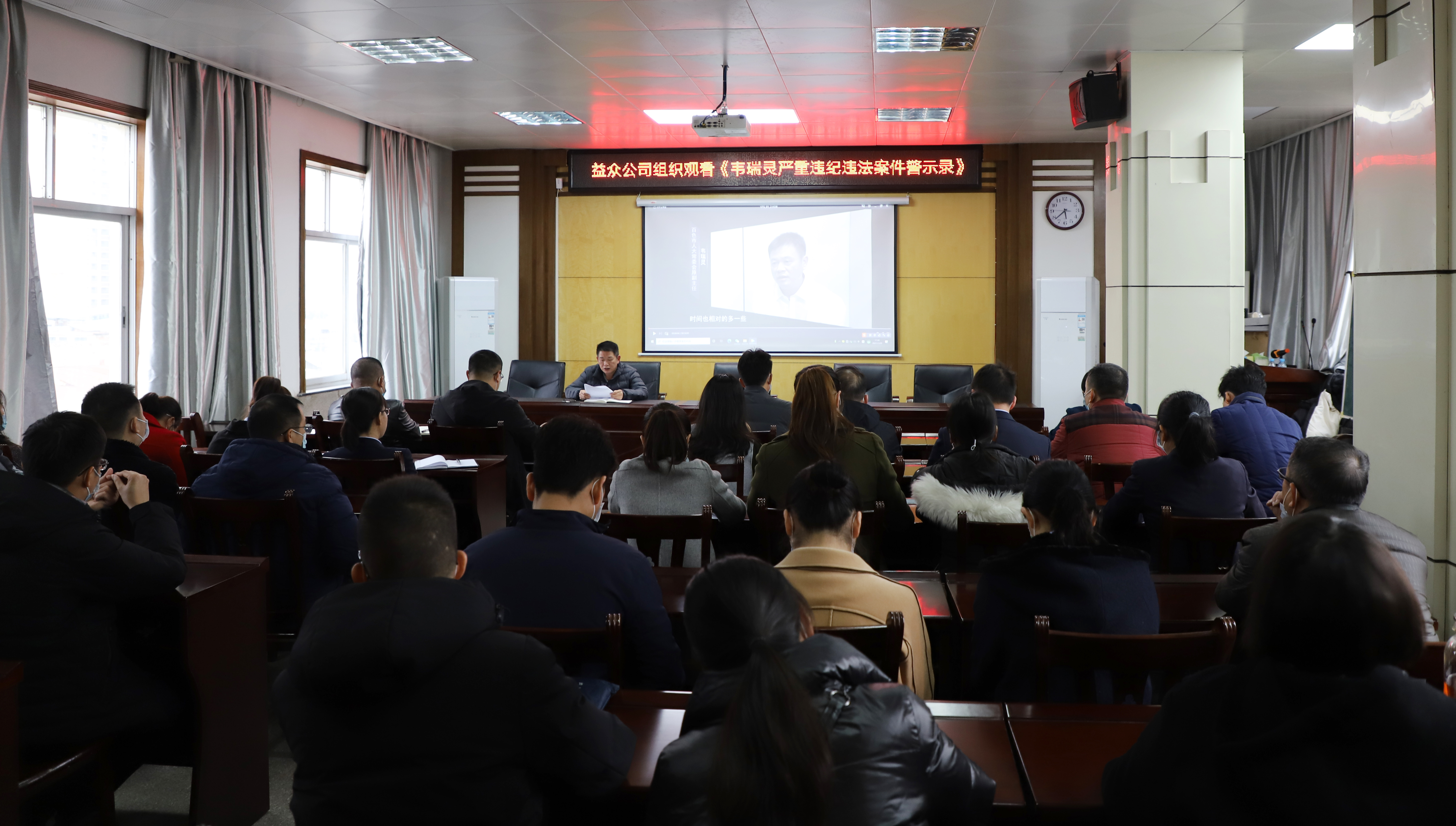 ????????根據右江區委要求,結合“不忘初心、牢記使命”主題教育。1月29日,益眾公司領(lǐng)導班子成員、全體黨員干部及各部門(mén)(子公司)中層干部集中觀(guān)看了《理想信念滑坡是最危險的滑坡——廣西百色市人大常委會(huì )原副主任韋瑞靈嚴重違紀違法案件警示錄》專(zhuān)題片。