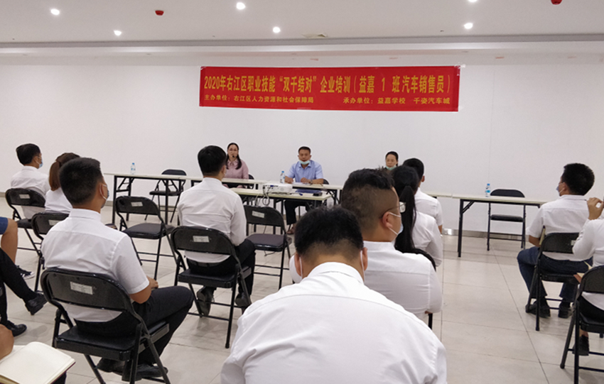 近日,由百色市右江區人力資源和社會(huì )保障局主辦,廣西百色益嘉職業(yè)技能培訓學(xué)校、右江區新姿投資股份有限公司承辦的2020年右江區職業(yè)技能“雙千結對”企業(yè)培訓(益嘉1班汽車(chē)銷(xiāo)售員)在千姿汽車(chē)城順利開(kāi)班,培訓期十天,約50名汽車(chē)銷(xiāo)售人員參加培訓。