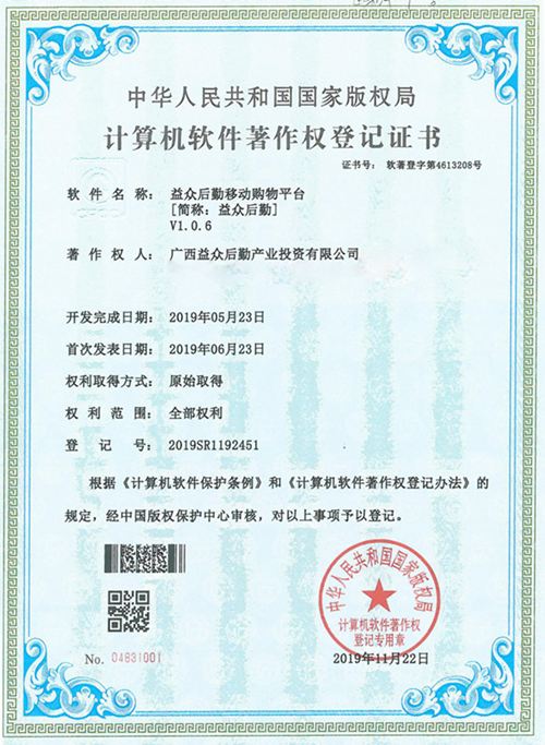 “益眾后勤移動(dòng)購物平臺”即益眾后勤APP,是廣西益眾后勤產(chǎn)業(yè)投資有限公司與建設銀行百色分行聯(lián)合開(kāi)發(fā)的線(xiàn)上線(xiàn)下交易系統消費者可以通過(guò)手機APP實(shí)現便捷消費。該證書(shū)的獲得是我公司在互聯(lián)網(wǎng)自主研發(fā)創(chuàng )新及自主知識產(chǎn)權保護的重大突破,是益眾后勤網(wǎng)上商城在計算機軟件領(lǐng)域里得到的權威認可,標志著(zhù)我公司在互聯(lián)網(wǎng)軟件研發(fā)應用領(lǐng)域邁上了一個(gè)新的臺階。