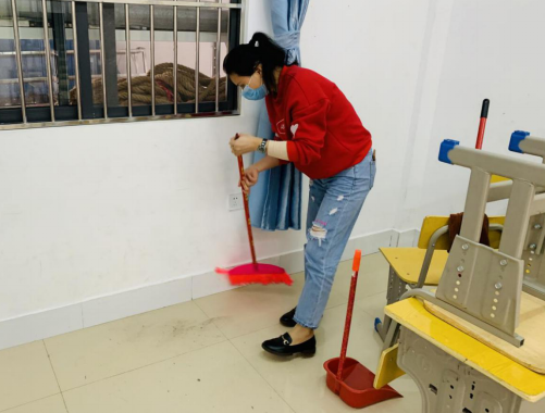 教職工認真打掃教室的每一個(gè)角落