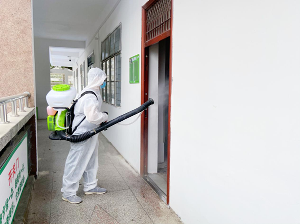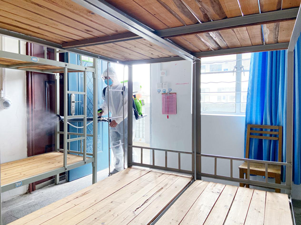 醫務(wù)人員對各宿舍進(jìn)行消毒