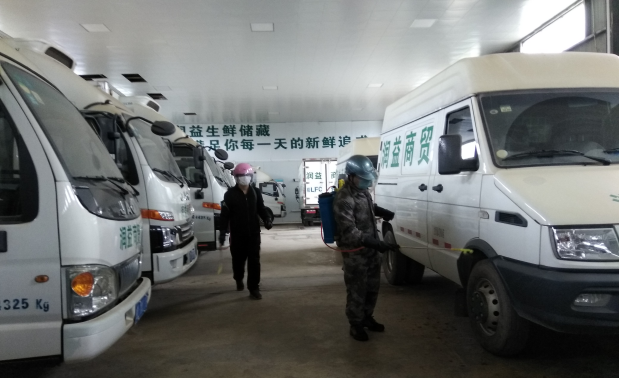 潤益商貿公司工作人員正在消毒配送車(chē)輛?