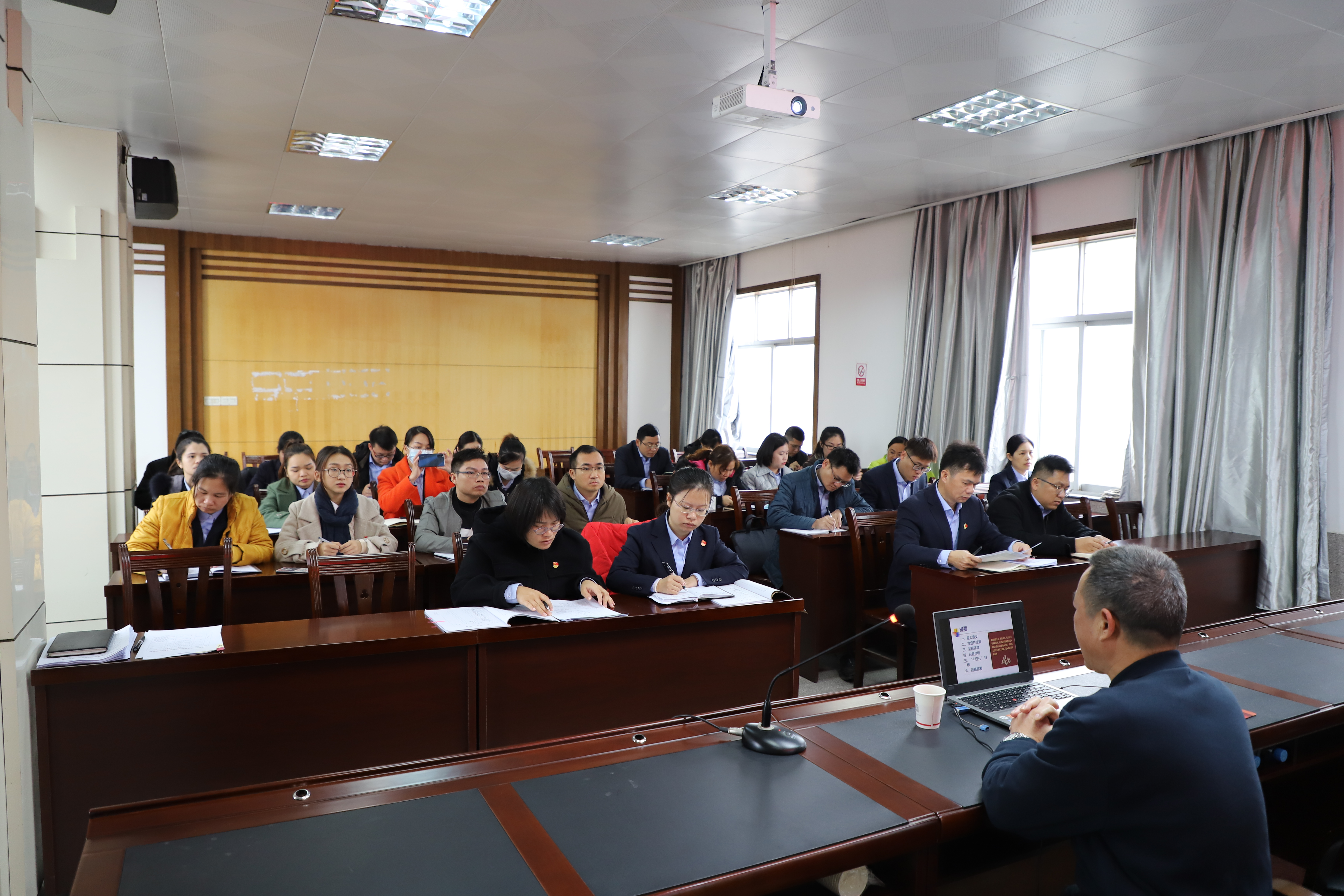 ????????右江區宣講團黨的十九屆五中全會(huì )精神宣講報告會(huì )益眾公司專(zhuān)場(chǎng)近日舉行,宣講團成員、區委黨校講師易祖文作宣講報告。公司領(lǐng)導干部、黨員、入黨積極分子約30人聆聽(tīng)報告。