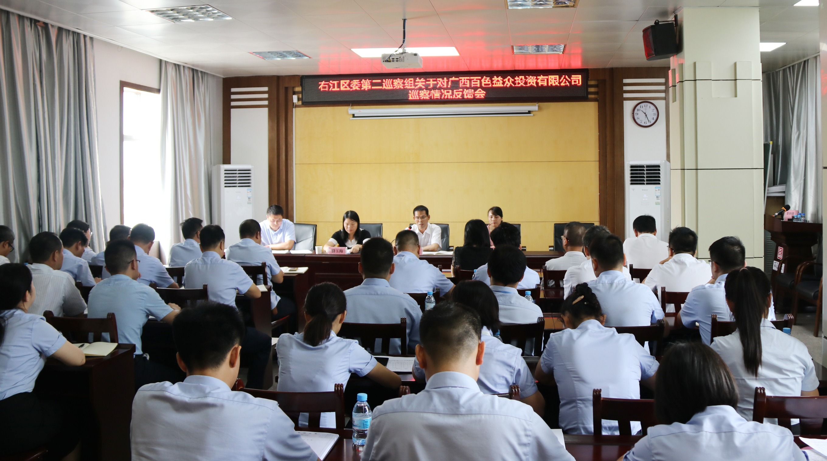 ???????9月17日上午,右江區委第二巡察組對廣西百色益眾投資有限公司巡察情況反饋會(huì )議在益眾公司辦公樓7樓會(huì )議室召開(kāi)。區委第二巡察組組長(cháng)黃梅艷在會(huì )上反饋巡察意見(jiàn),益眾公司總經(jīng)理趙家臣主持會(huì )議并作表態(tài)發(fā)言。