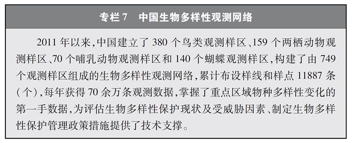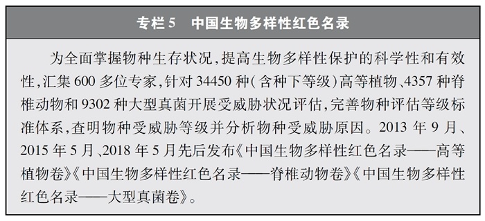 開(kāi)展全國生物多樣性調查與評估。大力推進(jìn)生物多樣性保護重大工程實(shí)施,結合自然資源調查、生態(tài)系統監測評估等工作,不斷完善生物多樣性調查與評估能力,首次將生物多樣性指標納入生態(tài)質(zhì)量綜合評價(jià)指標體系,引導地方加強生態(tài)文明建設與生物多樣性保護。開(kāi)展自然資源調查,包括森林、草原、水、濕地、荒漠、海洋等,建立自然資源調查評價(jià)監測制度。構建了涵蓋2376個(gè)縣級行政單元、樣線(xiàn)總長(cháng)超過(guò)3.4萬(wàn)公里的物種分布數據庫,建立物種資源調查及收集信息平臺,準確反映野生動(dòng)植物空間分布狀況。完成長(cháng)江經(jīng)濟帶、京津冀等國家戰略區域180多個(gè)縣級行政區生物多樣性調查與評估。組織開(kāi)展近海漁業(yè)資源調查,初步掌握近海漁業(yè)資源狀況。陸續發(fā)布《中國植物紅皮書(shū)》《中國瀕危動(dòng)物紅皮書(shū)》《中國物種紅色名錄》《中國生物多樣性紅色名錄》,基本掌握生物多樣性總體情況,為加強生物多樣性保護奠定了科學(xué)基礎。