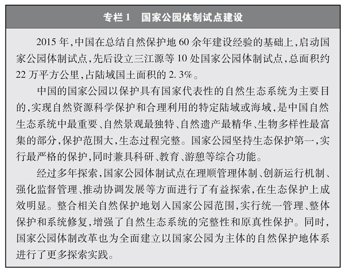 中國不斷推進(jìn)自然保護地建設,啟動(dòng)國家公園體制試點(diǎn),構建以國家公園為主體的自然保護地體系,率先在國際上提出和實(shí)施生態(tài)保護紅線(xiàn)制度,明確了生物多樣性保護優(yōu)先區域,保護了重要自然生態(tài)系統和生物資源,在維護重要物種棲息地方面發(fā)揮了積極作用。