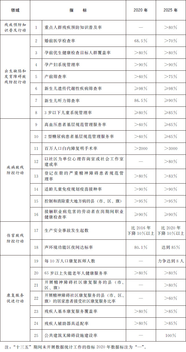 到2025年,覆蓋經(jīng)濟社會(huì )發(fā)展各領(lǐng)域的殘疾預防政策體系進(jìn)一步完善,全人群全生命周期殘疾預防服務(wù)網(wǎng)絡(luò )更加健全,全民殘疾預防素養明顯提升,遺傳和發(fā)育、疾病、傷害等主要致殘因素得到有效防控,殘疾康復服務(wù)狀況持續改善,殘疾預防主要指標處于中高收入國家前列。