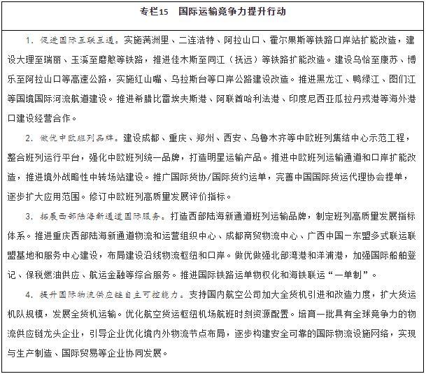 加強戰略骨干通道建設。推進(jìn)出疆入藏通道建設,擴大甘新、青新、青藏、川藏四條內聯(lián)主通道通行能力,穩步推進(jìn)川藏鐵路建設,加快推進(jìn)新藏鐵路和田至日喀則段前期工作、適時(shí)啟動(dòng)重點(diǎn)路段建設,有序推進(jìn)滇藏鐵路前期工作,密實(shí)優(yōu)化航空航線(xiàn)網(wǎng)絡(luò )布局,構建多向聯(lián)通的通道布局。暢通沿江通道,加快建設沿江高鐵,優(yōu)化以高等級航道和干線(xiàn)鐵路、高速公路為骨干的沿江綜合運輸大通道功能。升級沿海通道,提高鐵路通道能力,推進(jìn)高速公路繁忙路段擴容改造,提升港口航道整體效能,構建大容量、高品質(zhì)的運輸走廊。貫通沿邊通道,提級改造普通國省干線(xiàn),推進(jìn)重點(diǎn)方向沿邊鐵路建設,提高安全保障水平。建設西部陸海新通道,發(fā)揮鐵路在陸路運輸中的骨干作用和港口在海上運輸中的門(mén)戶(hù)作用,強化東、中、西三條通路,形成大能力主通道,銜接國際運輸通道。