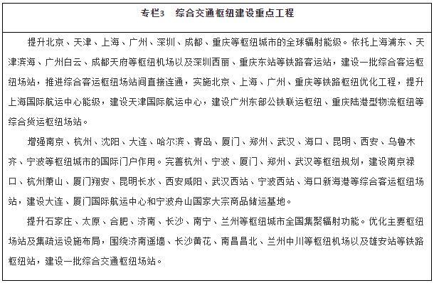建設多節點(diǎn)、網(wǎng)格狀、全覆蓋的京津冀一體化綜合交通網(wǎng)絡(luò ),基本建成軌道上的京津冀,高標準、高質(zhì)量打造雄安新區對外交通網(wǎng)絡(luò ),加強北京城市副中心與中心城區、廊坊北三縣交通基礎設施互聯(lián)互通,強化北京冬奧會(huì )、冬殘奧會(huì )交通保障。依托長(cháng)江黃金水道,整體設計推進(jìn)長(cháng)江經(jīng)濟帶綜合交通運輸體系建設,補強沿江高鐵和鐵路貨運能力,全力打通公路省際待貫通路段,提升江海聯(lián)運、鐵水聯(lián)運發(fā)展水平。推進(jìn)粵港澳大灣區基礎設施互聯(lián)互通,優(yōu)化航運和航空資源配置,加強港澳與內地的交通聯(lián)系,支持香港提升國際航運、國際航空樞紐地位。推動(dòng)長(cháng)三角地區交通運輸更高質(zhì)量一體化發(fā)展,加快對外交通、城際交通、都市圈交通高效銜接和有機融合,協(xié)同推進(jìn)港航、海事一體化發(fā)展,推動(dòng)上海市、江蘇省、浙江省、安徽省共建輻射全球的航運樞紐,加快提升江蘇通州灣江海聯(lián)動(dòng)示范區功能,打造長(cháng)江集裝箱運輸新出???。構建海南島內暢通、陸島連通、全球通達的現代綜合交通運輸體系,建設現代化綜合交通樞紐,穩步推進(jìn)自由貿易港建設。構建黃河流域綠色安全便捷綜合交通網(wǎng)絡(luò ),強化跨區域大通道建設。