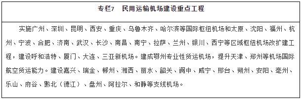 擴大航空網(wǎng)絡(luò )覆蓋。推動(dòng)區域機場(chǎng)群協(xié)同發(fā)展,建設京津冀、長(cháng)三角、粵港澳大灣區、成渝等世界級機場(chǎng)群。適時(shí)啟動(dòng)能力緊張樞紐機場(chǎng)改擴建工程,強化樞紐機場(chǎng)綜合保障能力。合理加密機場(chǎng)布局,穩步建設支線(xiàn)機場(chǎng)和專(zhuān)業(yè)性貨運樞紐機場(chǎng),提升綜合性機場(chǎng)貨運能力和利用率。有序推進(jìn)通用機場(chǎng)規劃建設,構建區域短途運輸網(wǎng)絡(luò ),探索通用航空與低空旅游、應急救援、醫療救護、警務(wù)航空等融合發(fā)展。優(yōu)化航路航線(xiàn)網(wǎng)絡(luò ),加強軍民航空管基礎設施建設,推廣應用空管新技術(shù)。