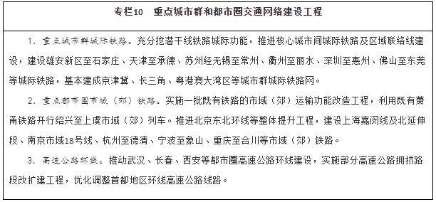強化重點(diǎn)城市群城際交通建設。圍繞京津冀、長(cháng)三角、粵港澳大灣區、成渝、長(cháng)江中游等城市群,以軌道交通、高速公路為骨干,提升城際運輸通道功能,加強核心城市快速直連,構建多節點(diǎn)、網(wǎng)絡(luò )化的城際交通網(wǎng),實(shí)現城市群內主要城市間2小時(shí)通達。整體推進(jìn)京津冀、長(cháng)三角、粵港澳大灣區城際鐵路和市域(郊)鐵路建設,有序推動(dòng)成渝地區雙城經(jīng)濟圈城際鐵路和市域(郊)鐵路建設,加強與高速鐵路、普速鐵路一體銜接,擴大對5萬(wàn)人口以上城鎮的有效覆蓋。