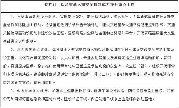 健全綜合交通運輸應急管理體制機制,完善應急協(xié)調機制和應急預案體系,加強交通運輸調度與應急指揮平臺建設。推進(jìn)區域性公路應急裝備物資儲備中心建設。加強水上交通安全監管、航海保障和救助打撈能力建設,完善沿海和內河溢油應急設備庫,構建陸??仗煲惑w化水上交通運輸安全保障體系。建設城市軌道交通應急演練中心。以骨干航空物流企業(yè)為主體構建航空應急服務(wù)網(wǎng)絡(luò )。建設海事監管指揮系統。在開(kāi)展城市交通基礎設施地下空間、低洼區域、重點(diǎn)區段、重要點(diǎn)位、關(guān)鍵設施等隱患排查基礎上,建立健全風(fēng)險臺賬和災害隱患清單,補齊設施設備、應急搶險物資等短板,持續完善應急處置預案,健全應急響應機制,提升應對極端天氣能力。加強應急專(zhuān)業(yè)隊伍和志愿者隊伍建設,充實(shí)國家應急運輸儲備力量。健全應對重大疫情、防范應對恐怖襲擊、保障信息安全等非傳統安全應急指揮體系和應急交通組織。